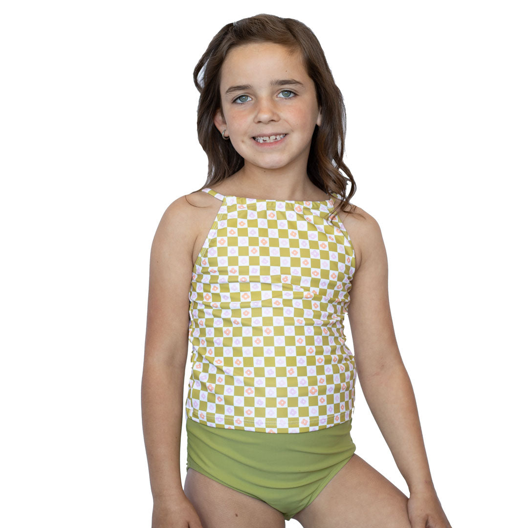 Designed with both fashion and functionality in mind, this crop-length tankini combines modern style with all-day comfort. Featuring adjustable straps, this top offers a customizable fit that grows with her, ensuring she feels secure and confident during all her water adventures. The fully lined interior adds an extra layer of comfort, making it perfect for hours of fun in the sun. The high neck design not only provides added coverage but also gives a trendy twist to traditional swimwear, making it ideal for the fashion-forward girl. Whether she's splashing in the pool or exploring the beach, this tankini top will keep her looking stylish and feeling free. Pair it with our matching swim bottoms for a complete look that’s perfect for summer escapades!