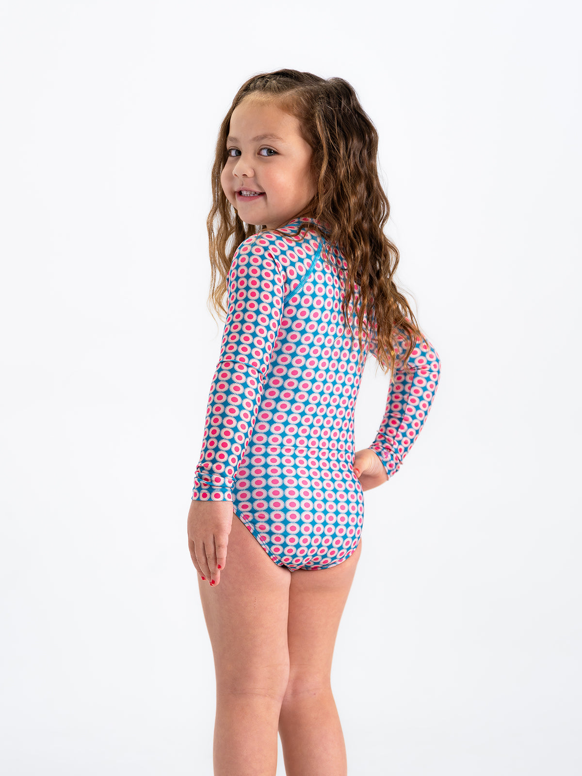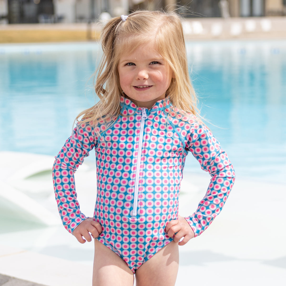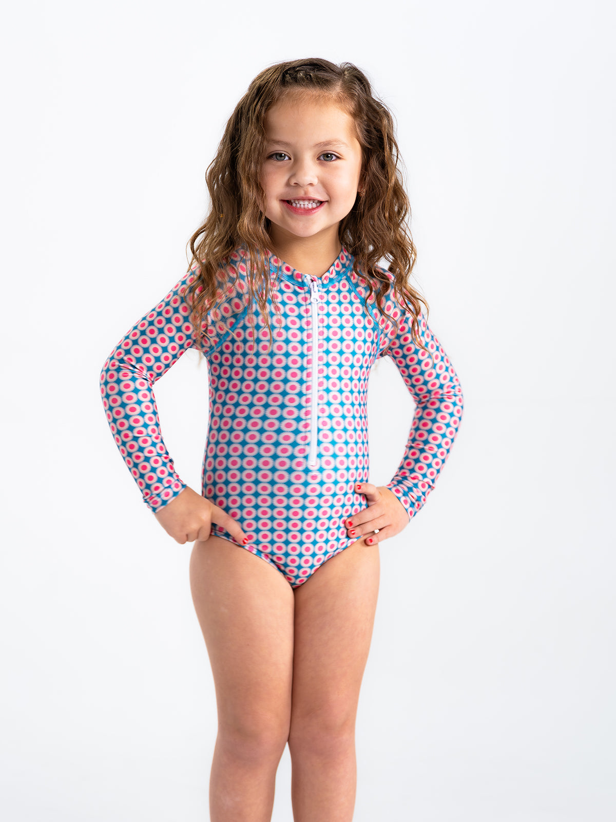 Prepare your little one for sunny adventures with our long sleeve rash guard one-piece swimsuit, designed for both fun and protection! This charming swimsuit features a convenient front zipper for easy on and off, making it perfect for little swimmers eager to dive right in. Crafted with a fully lined front and back, it offers enhanced comfort while allowing for unrestricted movement. The long sleeves provide extra sun protection, and with UPF 50+ fabric, you can have peace of mind knowing she’s shielded from harmful rays during her outdoor play. With full bum coverage, this swimsuit ensures she can splash, swim, and play freely without any worries. This one-piece is sure to become her favorite choice for beach days, pool parties, and summer fun!