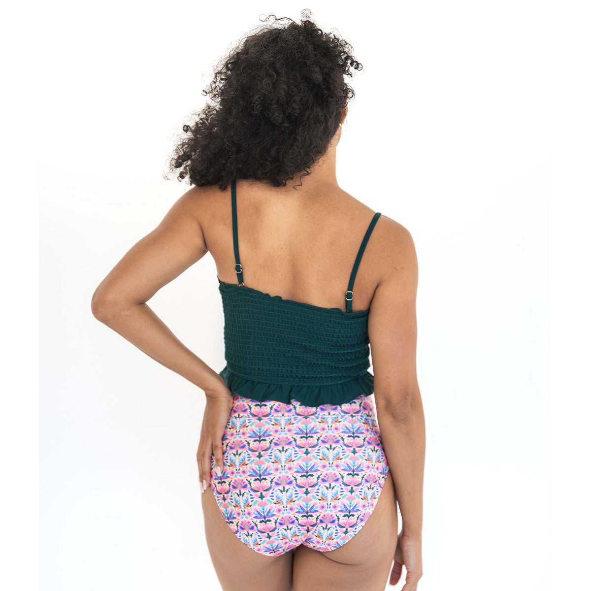 This stunning tankini top combines comfort and style with its attractive design. It features a smocking detail that provides an easy, secure, and stretchable fit for active women. The top also has adjustable shoulder straps for personalized fit and support. The delicate ruffle trim at the hemline adds a playful and sweet detail to this classic swim silhouette.