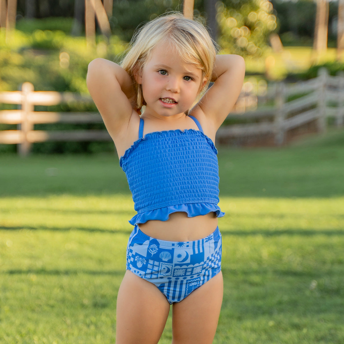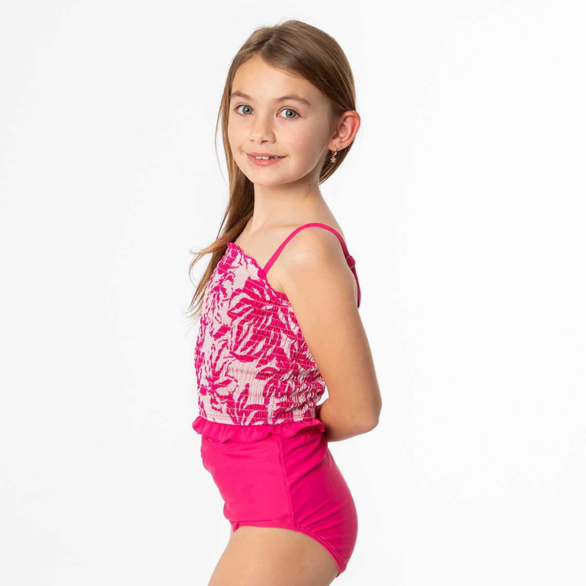 This delightful girls' tankini top combines comfort and style with its attractive design. It features a smocking detail that provides an easy, secure, and stretchable fit for active play. The top also has adjustable shoulder straps for personalized fit, and finished with a delicate ruffle trim at the hemline, adding a playful and sweet detail to this classic swim silhouette.